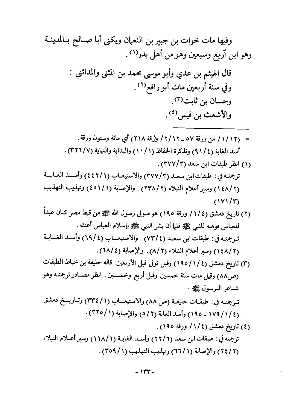وفيهَا مَاتَ خَوات بن جُبَير بن النُّعْمَان ويكنى أَبَا صَالح بِالْمَدِينَةِ وَهُوَ ابْن أَربع وَسبعين وَهُوَ من أهل بدر