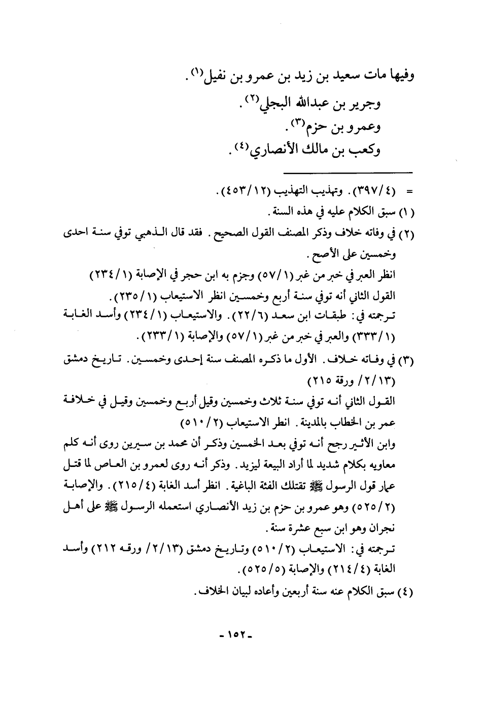 وفيهَا مَاتَ سعيد بن زيد بن عَمْرو بن نفَيْل وَجَرِير بن عبد الله البَجلِيّ وَعَمْرو بن حزم وَكَعب بن مَالك الْأنْصَارِيّ