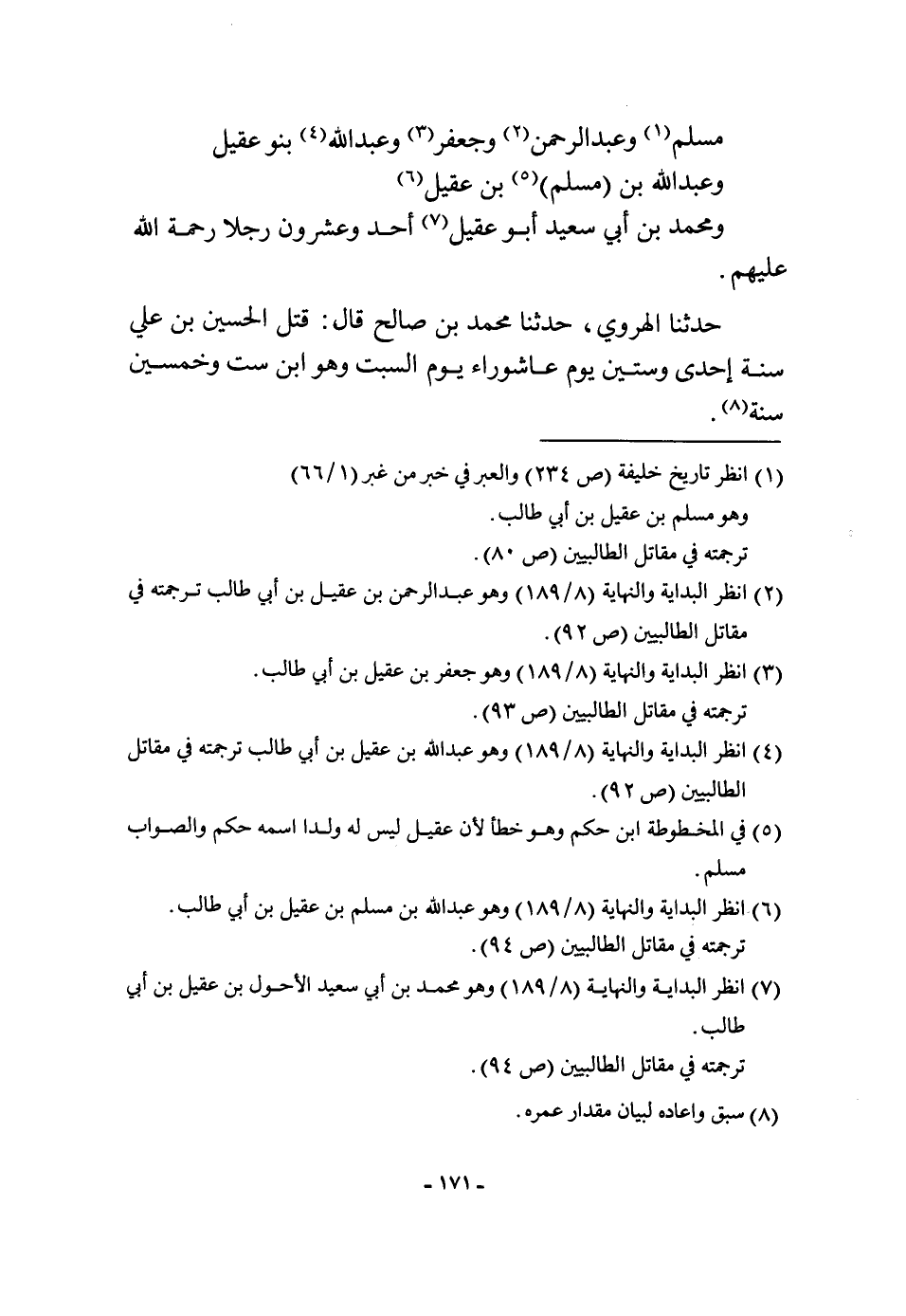 مُسلم وَعبد الرَّحْمَن وجعفر وَعبد الله بَنو عقيل وَعبد الله بن مُسلم بن عقيل وَمُحَمّد بن أبي سعيد أَبُو عقيل أحد وَعِشْرُونَ رجلا رَحْمَة الله عَلَيْهِم