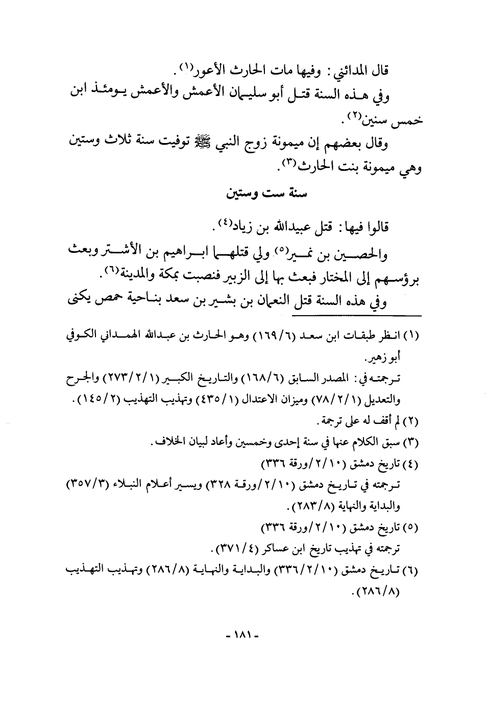 قَالُوا فِيهَا قتل عبيد الله بن زِيَاد وَالْحصين بن نمير ولي قَتلهمَا ابراهيم بن الأشتر وَبعث برؤسهم إِلَى الْمُخْتَار فَبعث بهَا إِلَى الزبير فَنصبت بِمَكَّة وَالْمَدينَة وَفِي هَذِه السّنة قتل النُّعْمَان بن بشير بن سعد بِنَاحِيَة حمص يكنى