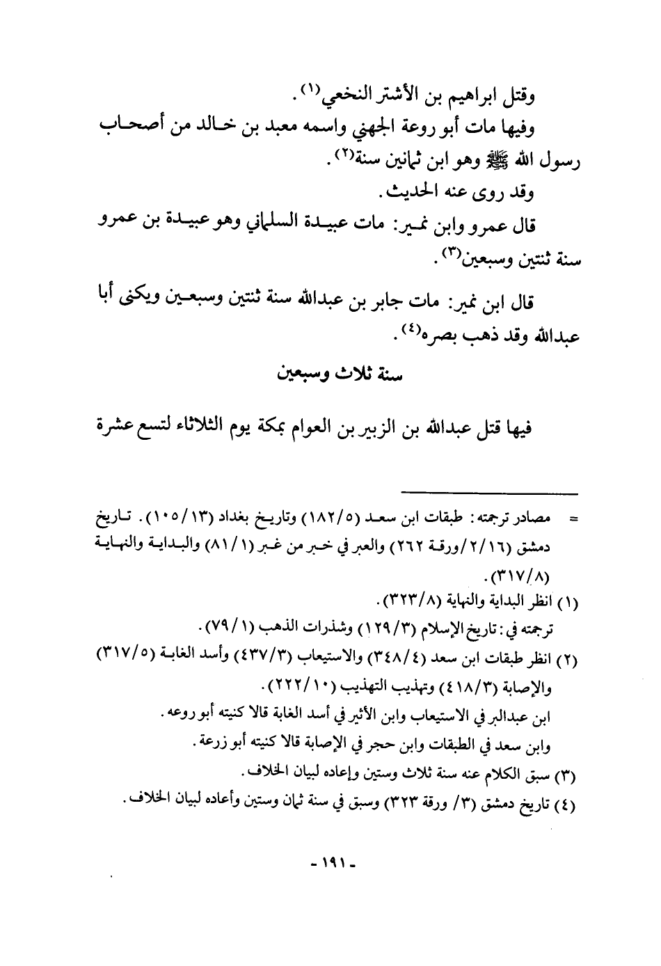 وَقتل إِبْرَاهِيم بن الأشتر النَّخعِيّ وفيهَا مَاتَ أَبُو روعة الْجُهَنِيّ واسْمه معبد بن خَالِد من أَصْحَاب رَسُول الله صلى الله عَلَيْهِ وَسلم وَهُوَ ابْن ثَمَانِينَ سنة وَقد روى عَنهُ الحَدِيث قَالَ عَمْرو وَابْن نمير مَاتَ عُبَيْدَة السَّلمَانِي وَهُوَ عُبَيْدَة بن عَمْرو سنة ثِنْتَيْنِ وَسبعين