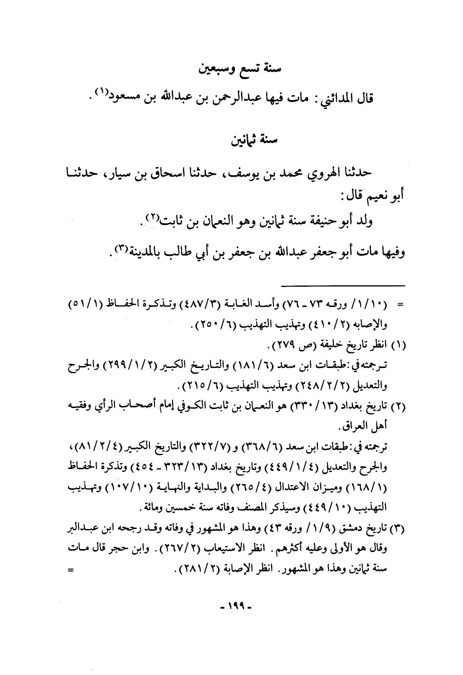 حَدثنَا الْهَرَوِيّ مُحَمَّد بن يُوسُف حَدثنَا إِسْحَاق بن سيار حَدثنَا أَبُو نعيم قَالَ ولد أَبُو حنيفَة سنة ثَمَانِينَ وَهُوَ النُّعْمَان بن ثَابت وفيهَا مَاتَ أَبُو جَعْفَر عبد الله بن جَعْفَر بن أبي طَالب بِالْمَدِينَةِ