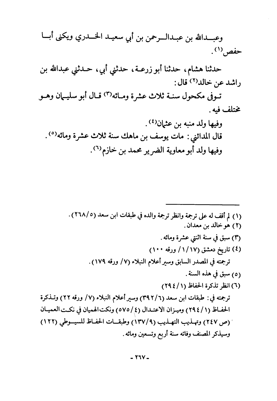 حَدثنَا هِشَام حَدثنَا أَبُو زرْعَة حَدثنِي أبي عبد الله بن رَاشد عَن خَالِد قَالَ توفّي مَكْحُول سنة ثَلَاث عشرَة وَمِائَة قَالَ أَبَا سُلَيْمَان وَهُوَ مُخْتَلف فِيهِ وفيهَا ولد مُنَبّه بن عُثْمَان