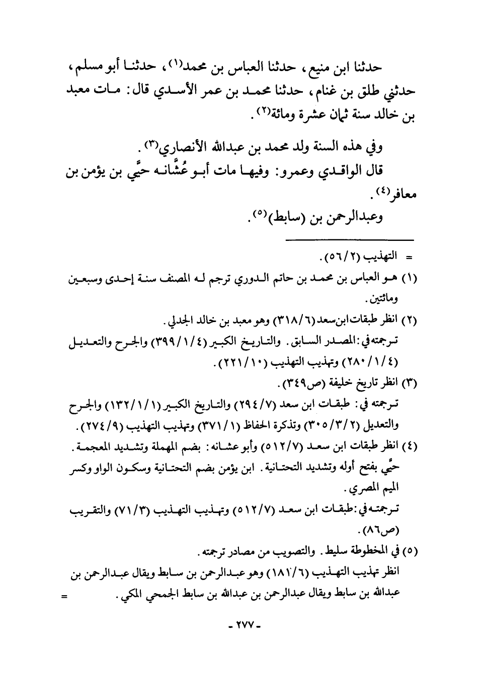 حَدثنَا ابْن منيع حَدثنَا الْعَبَّاس بن مُحَمَّد حَدثنَا أَبُو مُسلم حَدثنِي طلق بن غَنَّام حَدثنَا مُحَمَّد بن عمر الْأَسدي قَالَ مَاتَ معبد بن خَالِد سنة ثَمَان عشرَة وَمِائَة وَفِي هَذِه السّنة ولد مُحَمَّد بن عبد الله الْأنْصَارِيّ