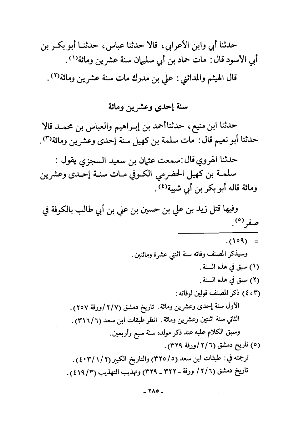 حَدثنَا الْهَرَوِيّ قَالَ سَمِعت عُثْمَان بن سعيد السجْزِي يَقُول سَلمَة بن كهيل الْحَضْرَمِيّ الْكُوفِي مَاتَ سنة إِحْدَى وَعشْرين وَمِائَة قَالَه أَبُو بكر بن أبي شيبَة وفيهَا قتل زيد بن عَليّ بن حُسَيْن بن عَليّ بن أبي طَالب بِالْكُوفَةِ فِي صفر