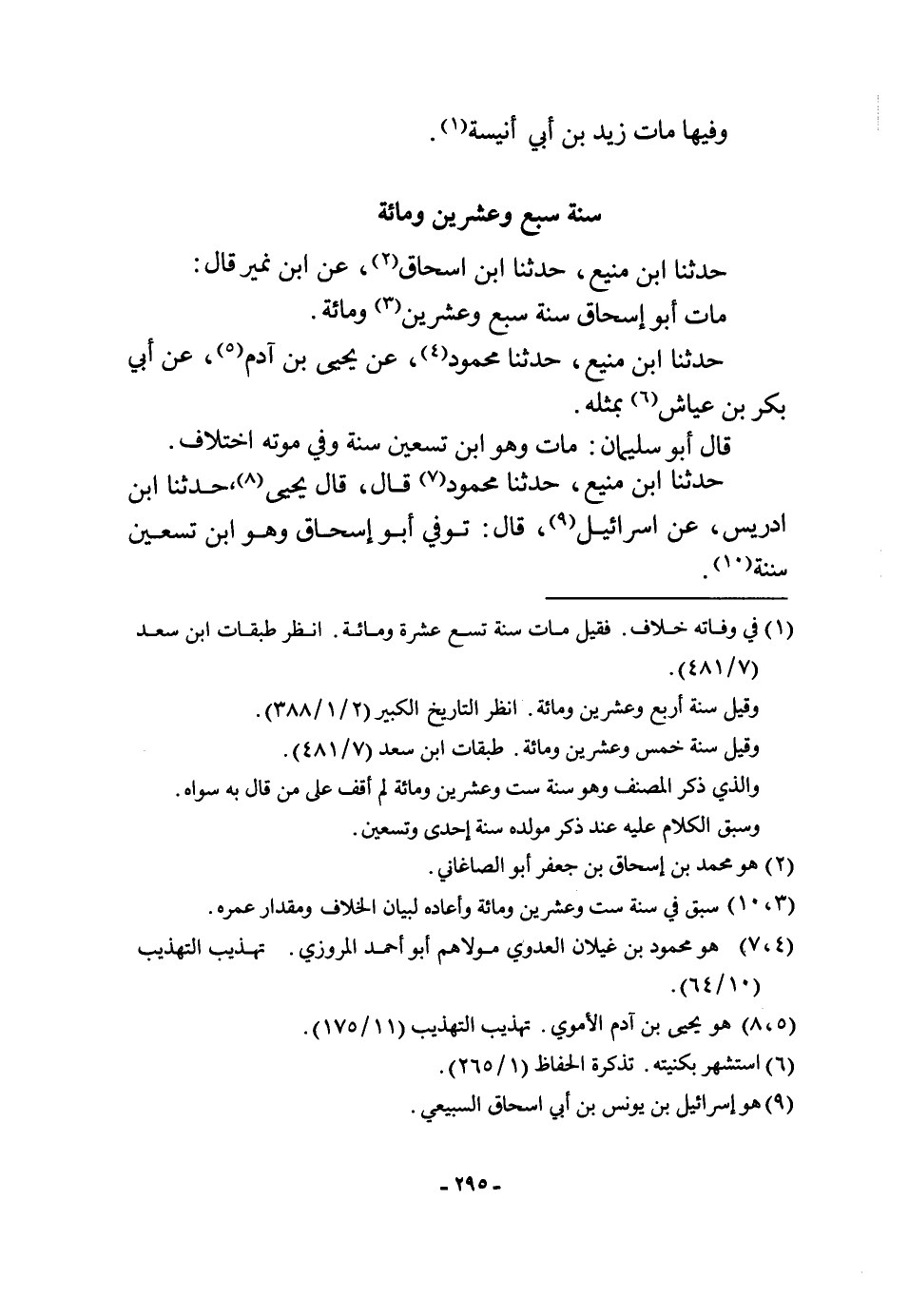 حَدثنَا ابْن منيع حَدثنَا مَحْمُود قَالَ قَالَ يحيى حَدثنَا ابْن إِدْرِيس عَن إِسْرَائِيل قَالَ توفّي أَبُو إِسْحَاق وَهُوَ ابْن تسعين سنة