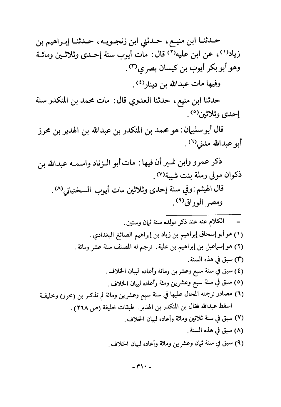 حَدثنَا ابْن منيع حَدثنِي ابْن زَنْجوَيْه حَدثنَا إِبْرَاهِيم بن زِيَاد عَن ابْن عَلَيْهِ قَالَ مَاتَ أَيُّوب سنة إِحْدَى وَثَلَاثِينَ وَمِائَة وَهُوَ أَبُو بكر أَيُّوب بن كيسَان بَصرِي