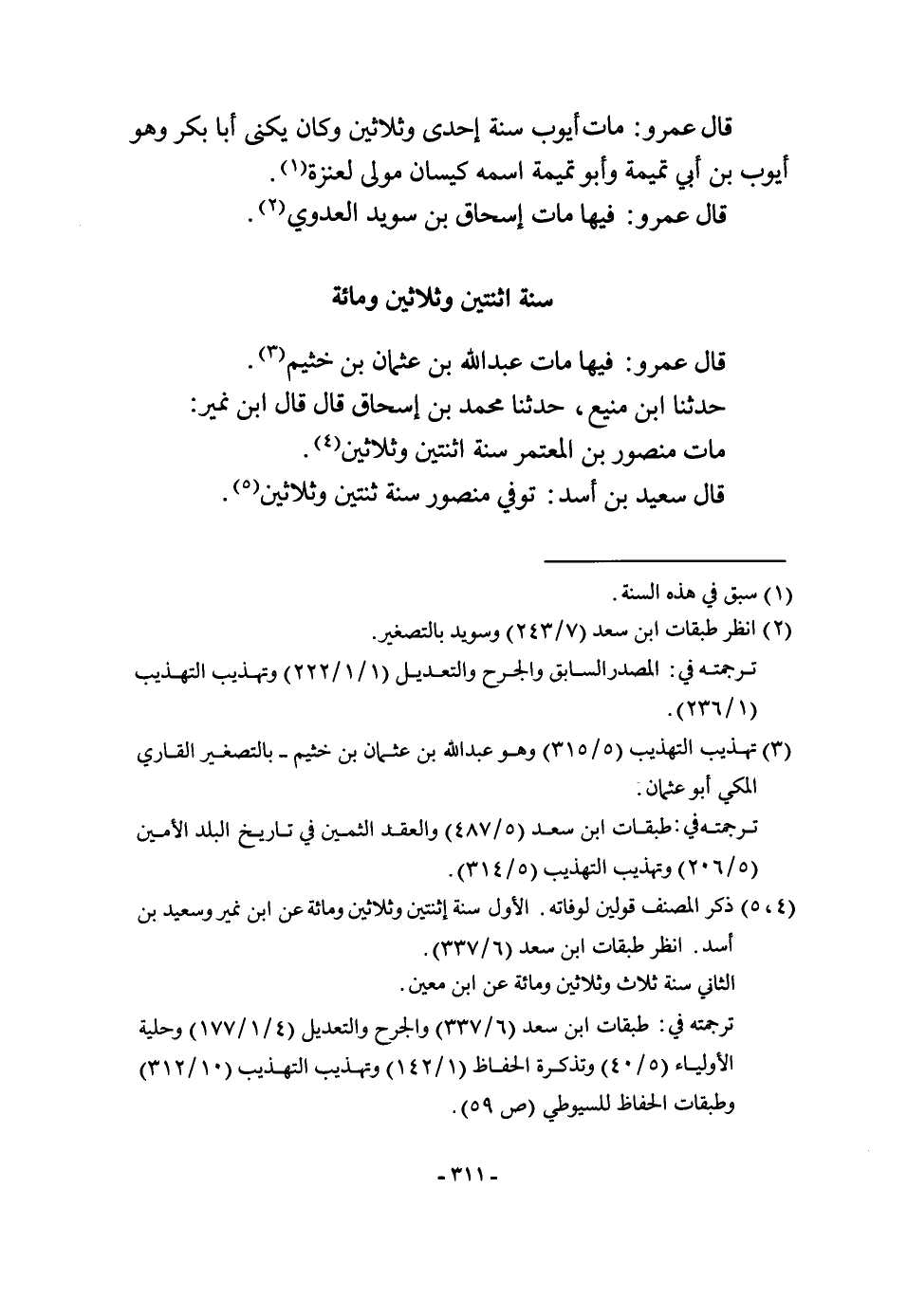 قَالَ عَمْرو مَاتَ أَيُّوب سنة إِحْدَى وَثَلَاثِينَ وَكَانَ يكنى أَبَا بكر وَهُوَ أَيُّوب بن أبي تَمِيمَة وَأَبُو تَمِيمَة اسْمه كيسَان مولى لعنزة