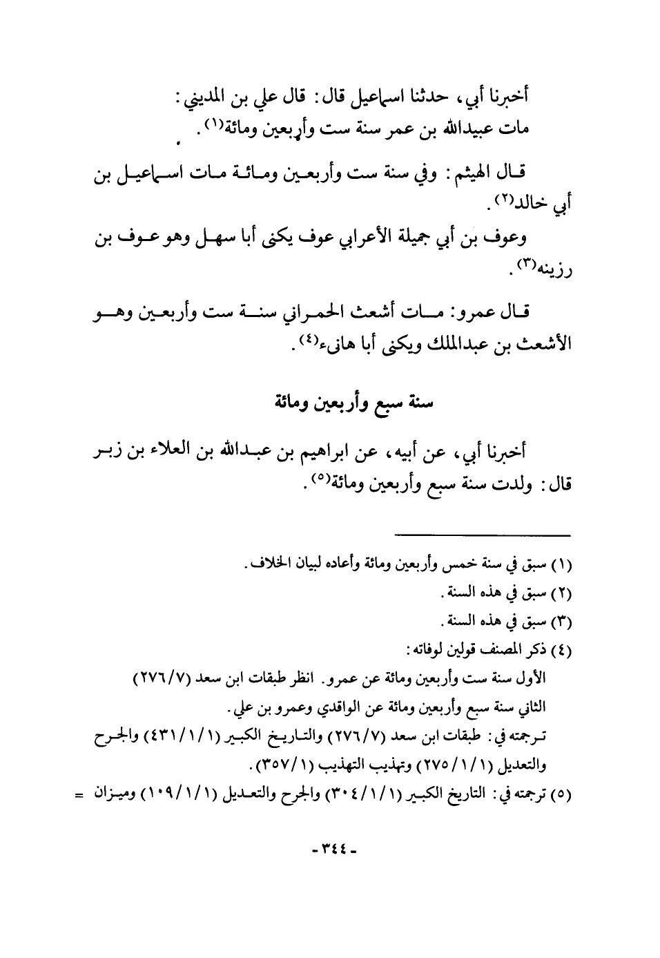 أخبرنَا أبي عَن أَبِيه عَن إِبْرَاهِيم بن عبد الله بن الْعَلَاء بن زبر قَالَ ولدت سنة سبع وَأَرْبَعين وَمِائَة