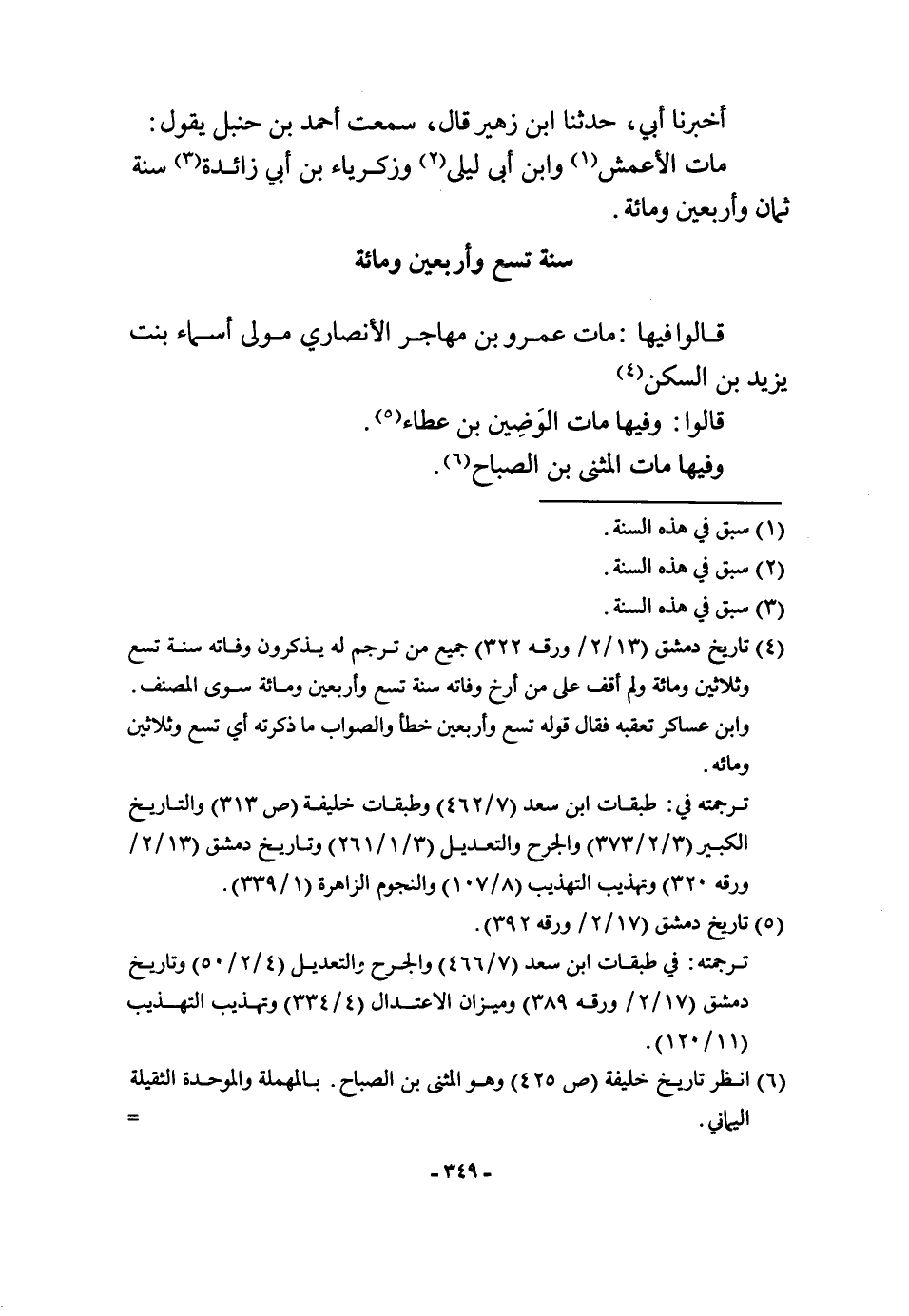 أخبرنَا أبي حَدثنَا ابْن زُهَيْر قَالَ سَمِعت أَحْمد بن حَنْبَل يَقُول مَاتَ الْأَعْمَش وَابْن أبي ليلى وزكرياء بن أبي زَائِدَة سنة ثَمَان وَأَرْبَعين وَمِائَة