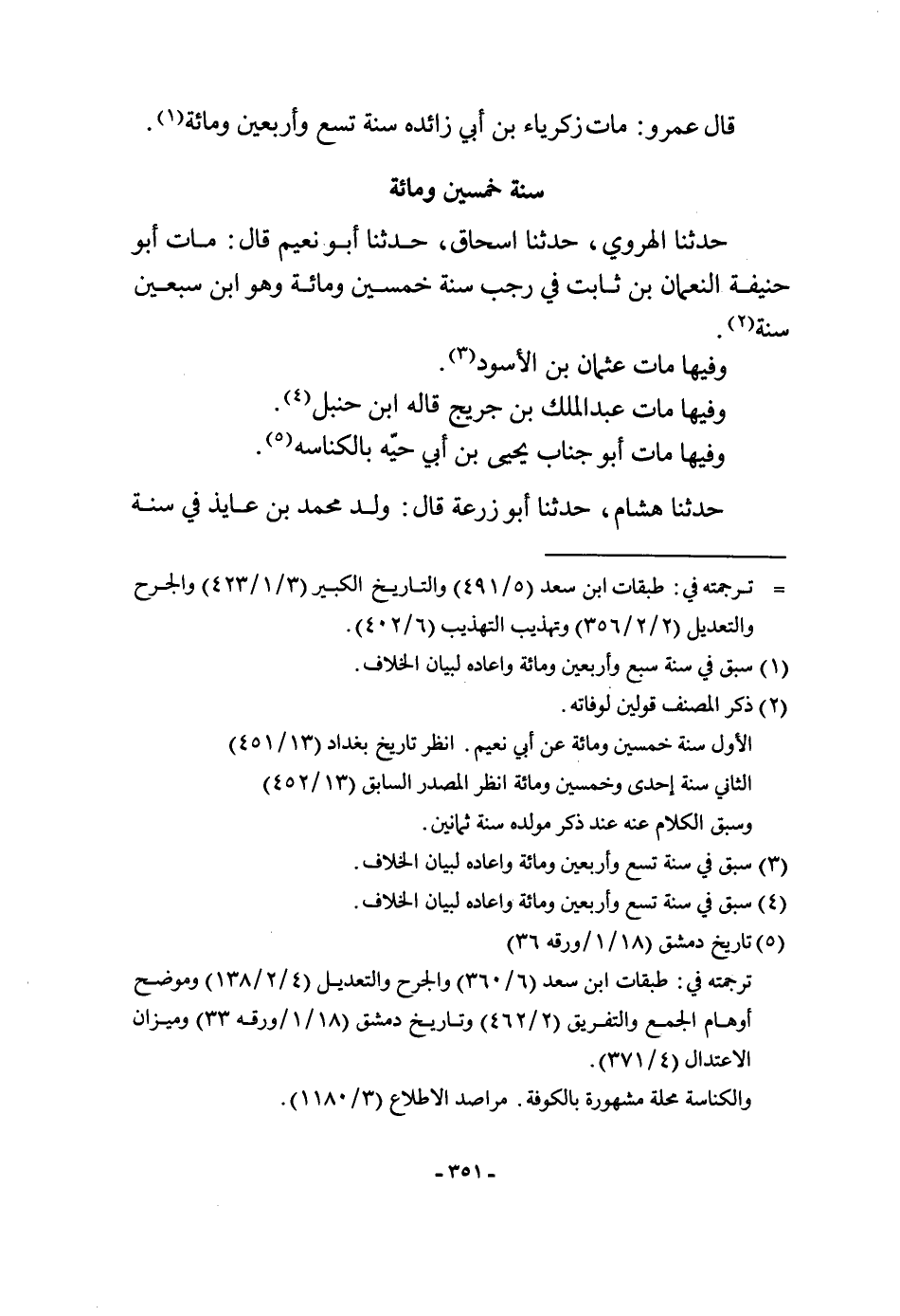 حَدثنَا الْهَرَوِيّ حَدثنَا إِسْحَاق حَدثنَا أَبُو نعيم قَالَ مَاتَ أَبُو حنيفَة النُّعْمَان بن ثَابت فِي رَجَب سنة خمسين وَمِائَة وَهُوَ ابْن سبعين سنة وفيهَا مَاتَ عُثْمَان بن الْأسود وفيهَا مَاتَ عبد الْملك بن جريج قَالَه ابْن حَنْبَل وفيهَا مَاتَ أَبُو جناب يحيى بن أبي حيه بالكناسه