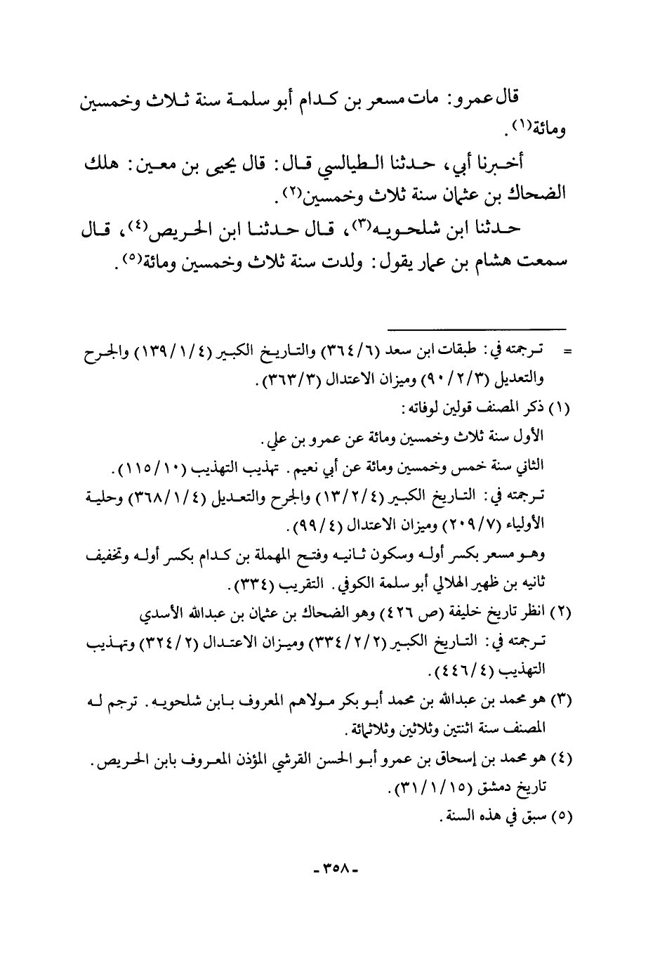 قَالَ عَمْرو مَاتَ مسعر بن كدام أَبُو سَلمَة سنة ثَلَاث وَخمسين وَمِائَة