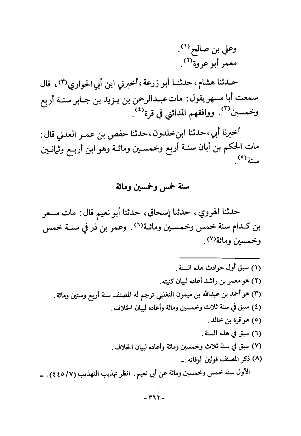 حَدثنَا الْهَرَوِيّ حَدثنَا إِسْحَاق حَدثنَا أَبُو نعيم قَالَ مَاتَ مسعر بن كدام سنة خمس وَخمسين وَمِائَة وَعمر بن ذَر فِي سنة خمس وَخمسين وَمِائَة