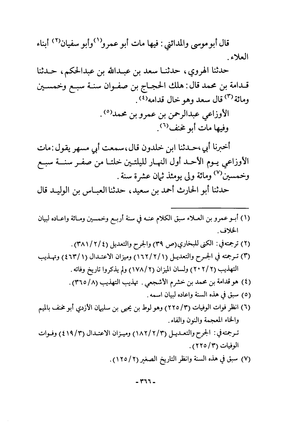 حَدثنَا الْهَرَوِيّ حَدثنَا سعد بن عبد الله بن عبد الحكم حَدثنَا قدامَة بن مُحَمَّد قَالَ هلك الْحجَّاج بن صَفْوَان سنة سبع وَخمسين وَمِائَة قَالَ سعد وَهُوَ خَال قدامه الْأَوْزَاعِيّ عبد الرَّحْمَن بن عَمْرو بن مُحَمَّد وفيهَا مَاتَ أَبُو مخنف