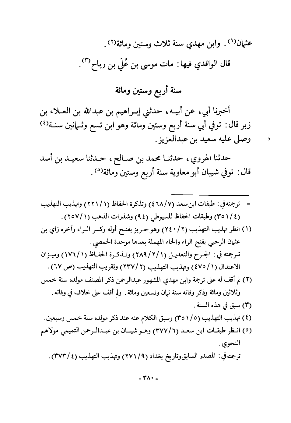 حَدثنَا الْهَرَوِيّ حَدثنَا مُحَمَّد بن صَالح حَدثنَا سعيد بن أَسد قَالَ توفّي شَيبَان أَبُو مُعَاوِيَة سنة أَربع وَسِتِّينَ وَمِائَة