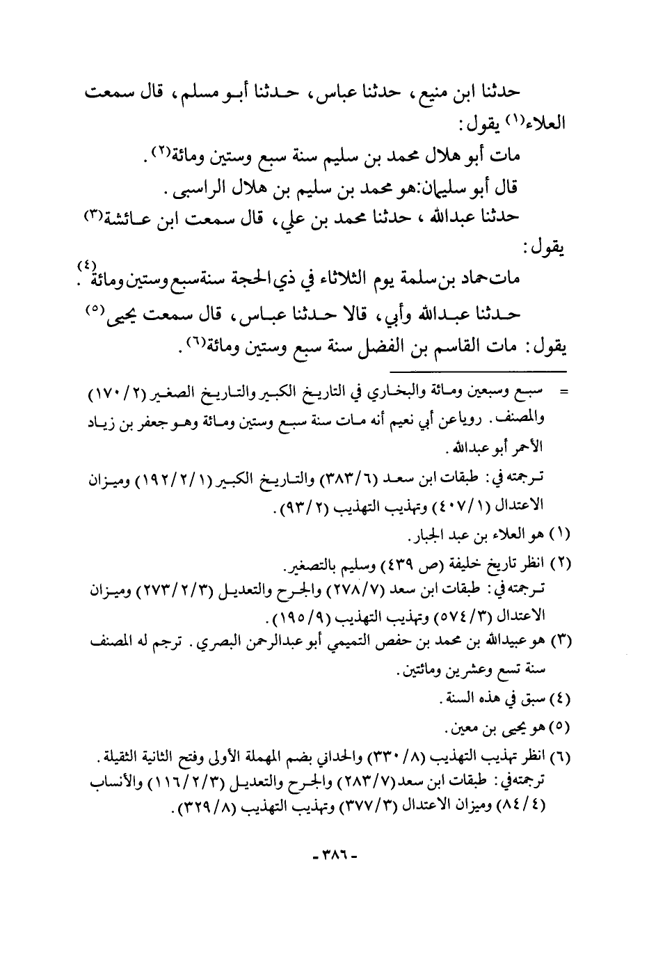 حَدثنَا ابْن منيع حَدثنَا عَبَّاس حَدثنَا أَبُو مُسلم قَالَ سَمِعت الْعَلَاء يَقُول مَاتَ أَبُو هِلَال مُحَمَّد بن سليم سنة سبع وَسِتِّينَ وَمِائَة قَالَ أَبُو سُلَيْمَان هُوَ مُحَمَّد بن سليم بن هِلَال الرَّاسِبِي