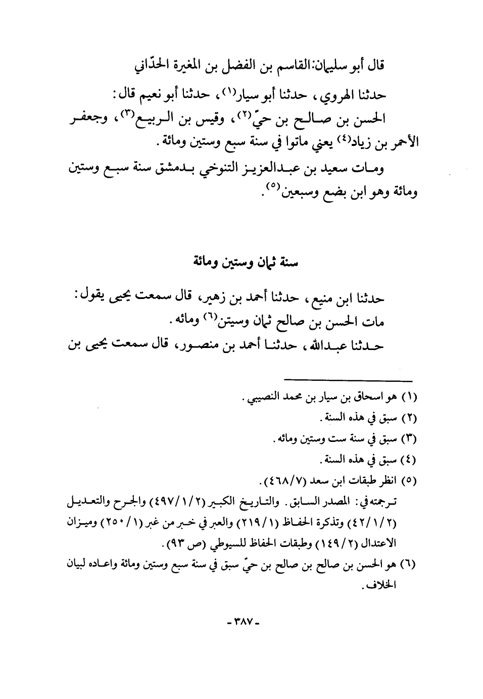 حَدثنَا الْهَرَوِيّ حَدثنَا أَبُو سيار حَدثنَا أَبُو نعيم قَالَ الْحسن بن صَالح بن حَيّ وَقيس بن الرّبيع وجعفر الْأَحْمَر بن زِيَاد يَعْنِي مَاتُوا فِي سنة سبع وَسِتِّينَ وَمِائَة وَمَات سعيد بن عبد الْعَزِيز التنوخي بِدِمَشْق سنة سبع وَسِتِّينَ وَمِائَة وَهُوَ ابْن بضع وَسبعين