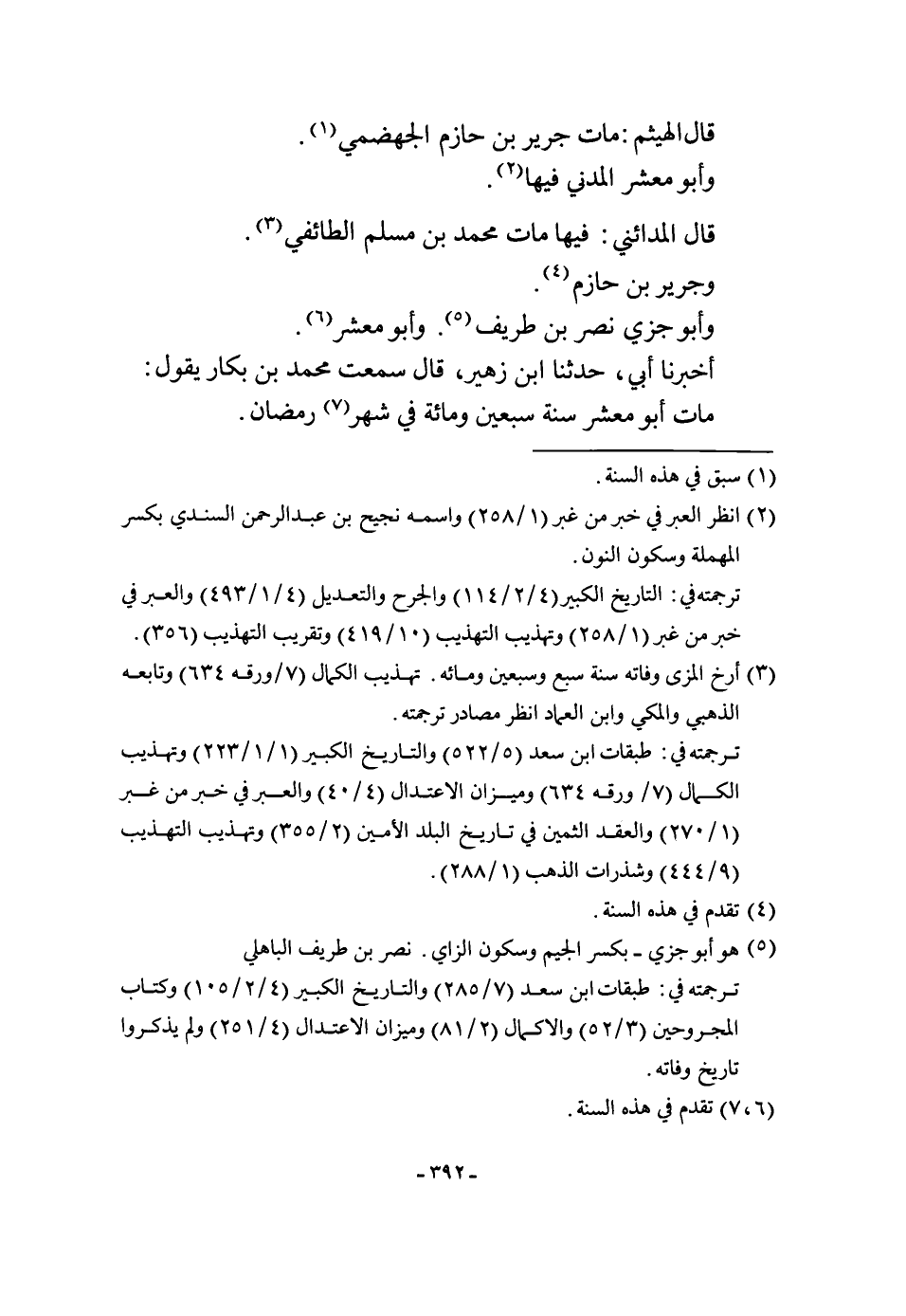 قَالَ الْهَيْثَم مَاتَ جرير بن حَازِم الْجَهْضَمِي وَأَبُو معشر الْمدنِي فِيهَا