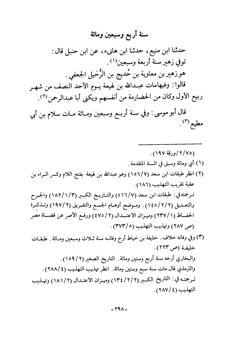 حَدثنَا ابْن منيع حَدثنَا ابْن هَانِئ عَن ابْن حَنْبَل قَالَ توفّي زُهَيْر سنة أَربع وَسبعين هُوَ زُهَيْر بن مُعَاوِيَة بن حديج بن الرحيل الْجعْفِيّ