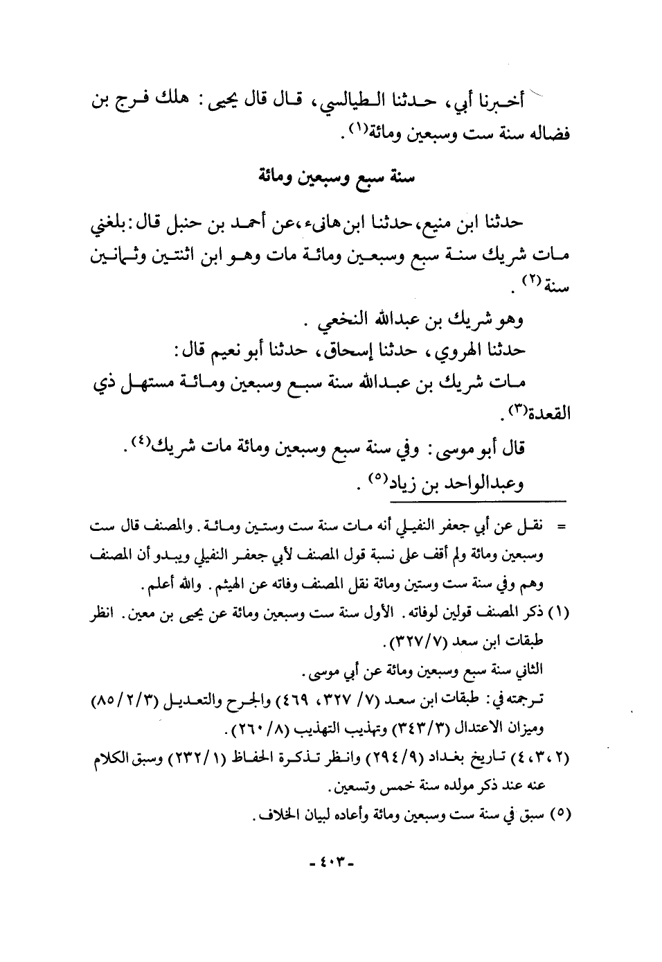 حَدثنَا ابْن منيع حَدثنَا ابْن هَانِئ عَن أَحْمد بن حَنْبَل قَالَ بَلغنِي مَاتَ شريك سنة سبع وَسبعين وَمِائَة مَاتَ وَهُوَ ابْن اثْنَتَيْنِ وَثَمَانِينَ سنة وَهُوَ شريك بن عبد الله النَّخعِيّ حَدثنَا الْهَرَوِيّ حَدثنَا إِسْحَاق حَدثنَا أَبُو نعيم قَالَ مَاتَ شريك بن عبد الله سنة سبع وَسبعين وَمِائَة مستهل ذِي الْقعدَة قَالَ أَبُو مُوسَى وَفِي سنة سبع وَسبعين وَمِائَة مَاتَ شريك وَعبد الْوَاحِد بن زِيَاد