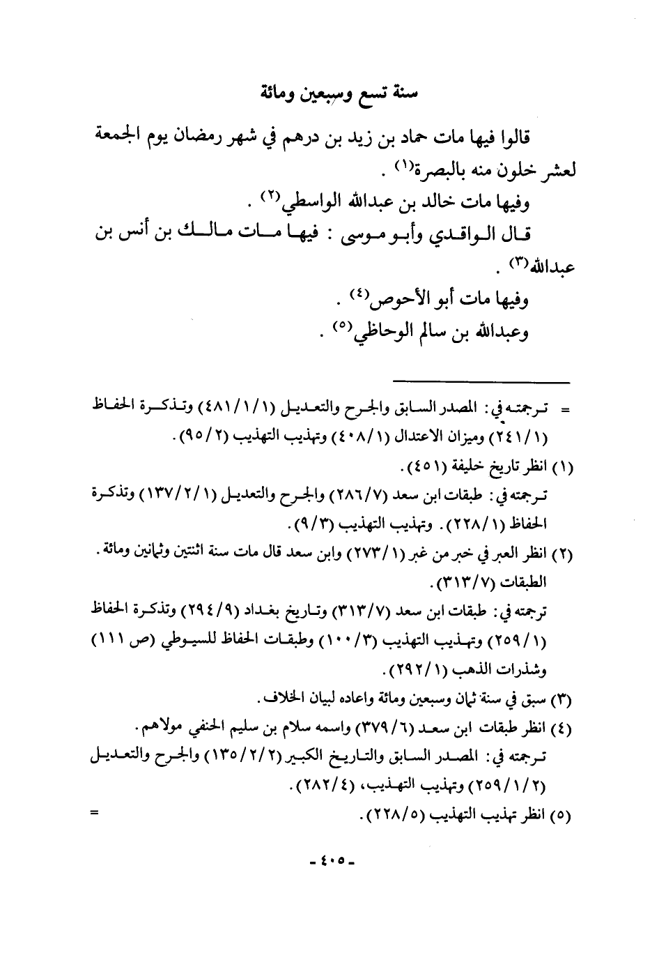 قَالُوا فِيهَا مَاتَ حَمَّاد بن زيد بن دِرْهَم فِي شهر رَمَضَان يَوْم الْجُمُعَة لعشر خلون مِنْهُ بِالْبَصْرَةِ وفيهَا مَاتَ خَالِد بن عبد الله الوَاسِطِيّ