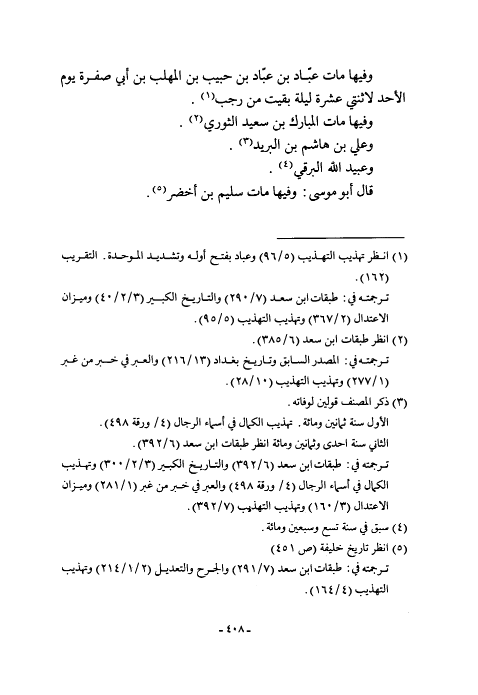 وفيهَا مَاتَ عباد بن عباد بن حبيب بن الْمُهلب بن أبي صفرَة يَوْم الْأَحَد لِاثْنَتَيْ عشرَة لَيْلَة بقيت من رَجَب وفيهَا مَاتَ الْمُبَارك بن سعيد الثَّوْريّ وَعلي بن هَاشم بن الْبَرِيد وَعبيد الله البرقي قَالَ أَبُو مُوسَى وفيهَا مَاتَ سليم بن أَخْضَر