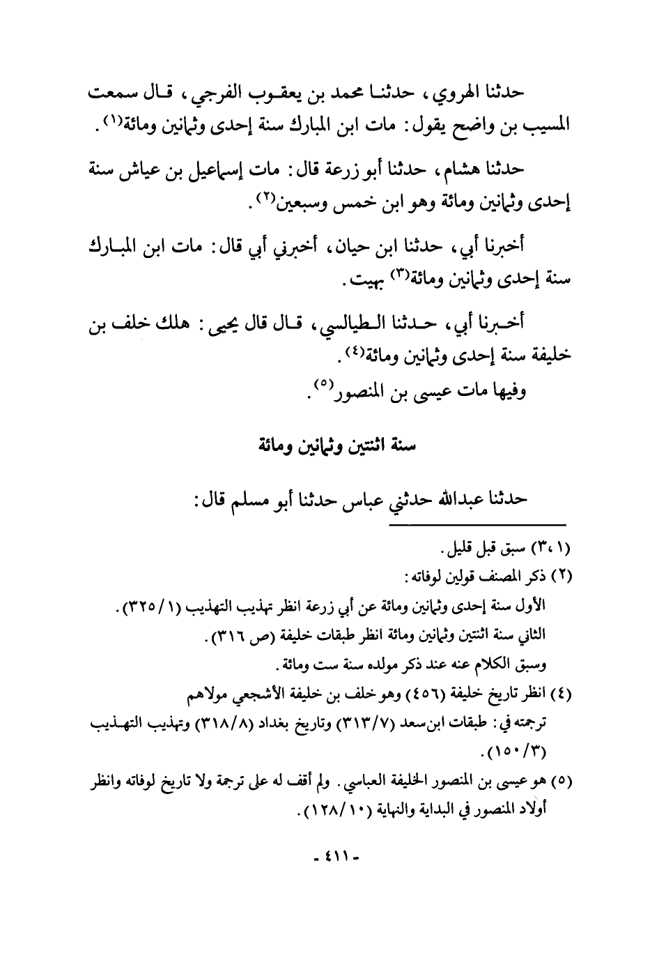 أخبرنَا أبي حَدثنَا الطَّيَالِسِيّ قَالَ قَالَ يحيى هلك خلف بن خَليفَة سنة إِحْدَى وَثَمَانِينَ وَمِائَة وفيهَا مَاتَ عِيسَى بن الْمَنْصُور