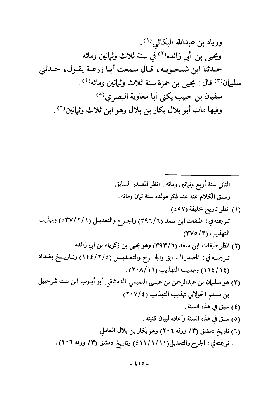 حَدثنَا ابْن شلحويه قَالَ سَمِعت أَبَا زرْعَة يَقُول حَدثنِي سُلَيْمَان قَالَ يحيى بن حَمْزَة سنة ثَلَاث وَثَمَانِينَ ومائه سُفْيَان بن حبيب يكنى أَبَا مُعَاوِيَة الْبَصْرِيّ وفيهَا مَاتَ أَبُو بِلَال بكار بن بِلَال وَهُوَ ابْن ثَلَاث وَثَمَانِينَ