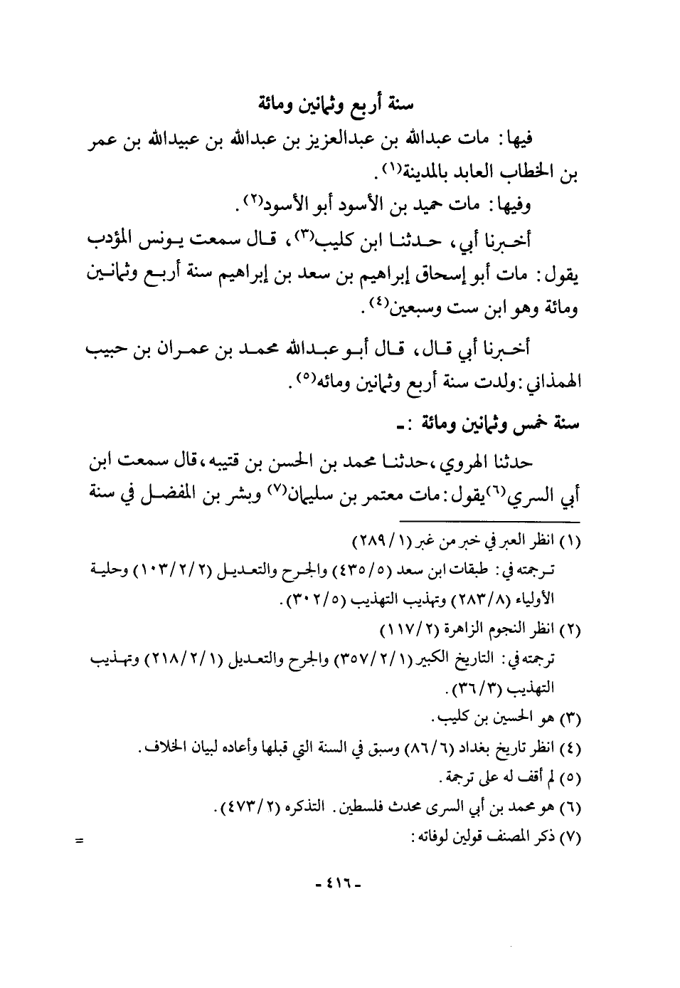 حَدثنَا الْهَرَوِيّ حَدثنَا مُحَمَّد بن الْحسن بن قتيبه قَالَ سَمِعت ابْن أبي السّري يَقُول مَاتَ مُعْتَمر بن سُلَيْمَان وَبشر بن الْمفضل فِي سنة