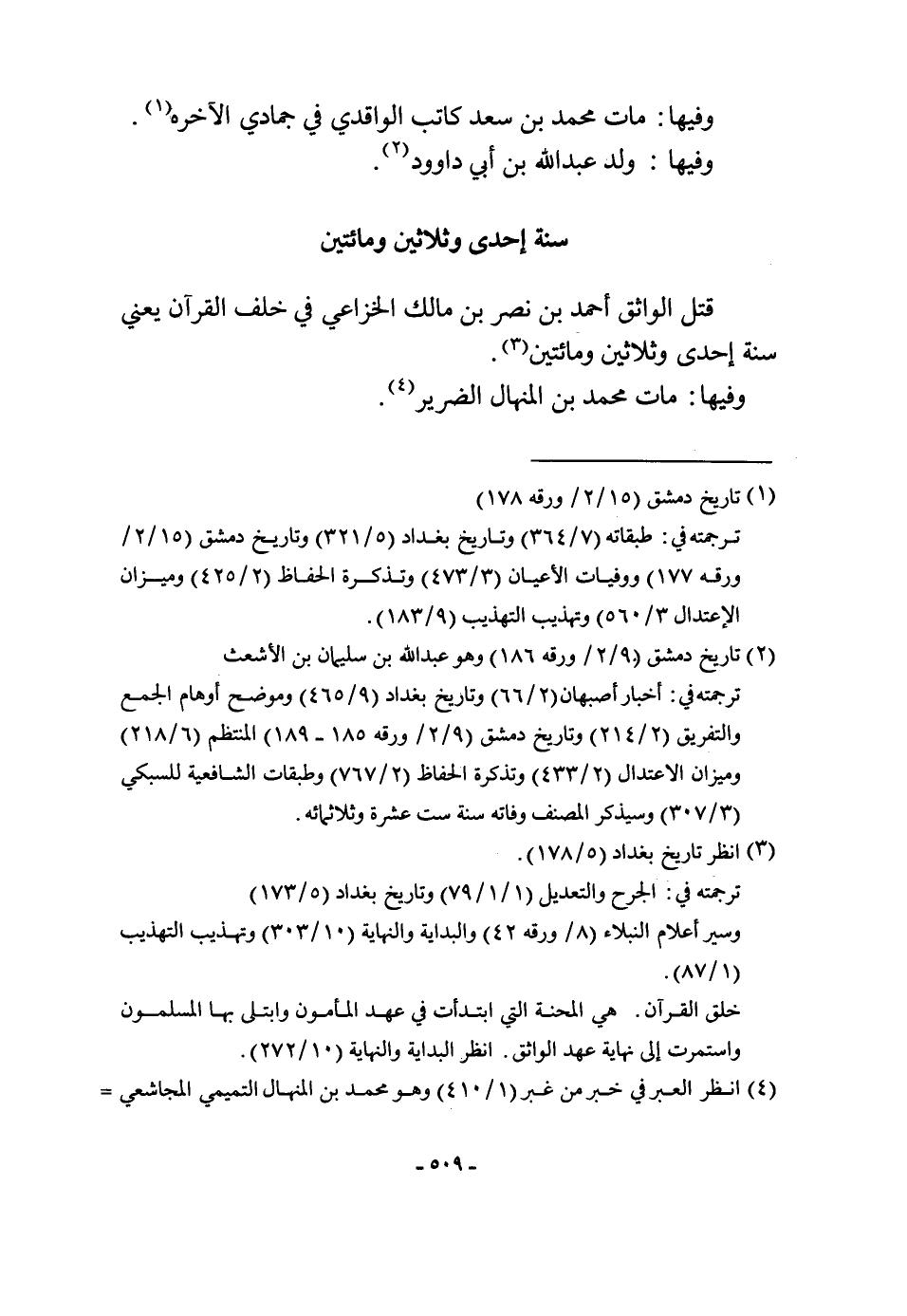 قتل الواثق أَحْمد بن نصر بن مَالك الْخُزَاعِيّ فِي خلف الْقُرْآن يَعْنِي سنة إِحْدَى وَثَلَاثِينَ وَمِائَتَيْنِ