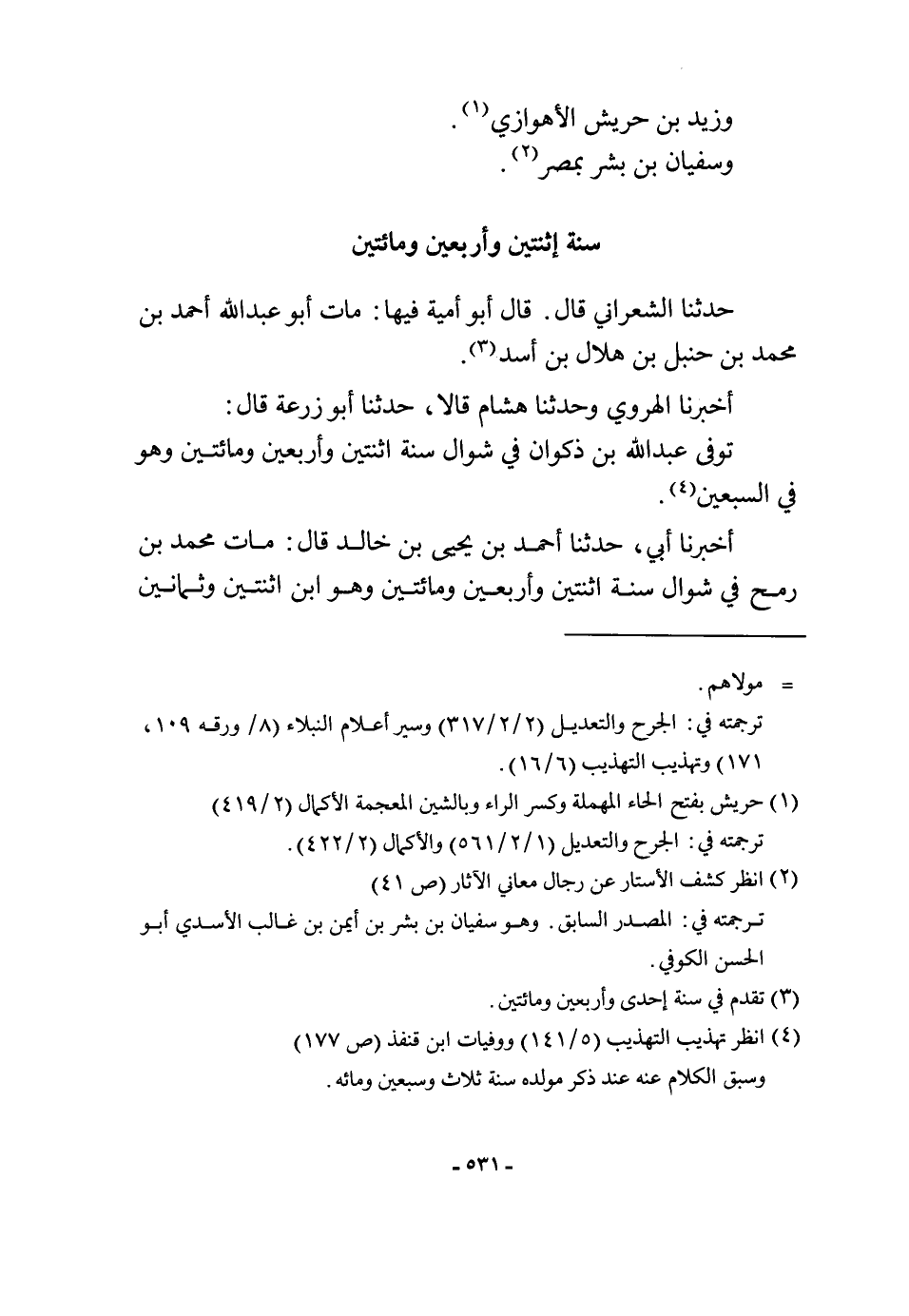حَدثنَا الشعراني قَالَ قَالَ أَبُو أُميَّة فِيهَا مَاتَ أَبُو عبد الله أَحْمد بن مُحَمَّد بن حَنْبَل بن هِلَال بن أَسد