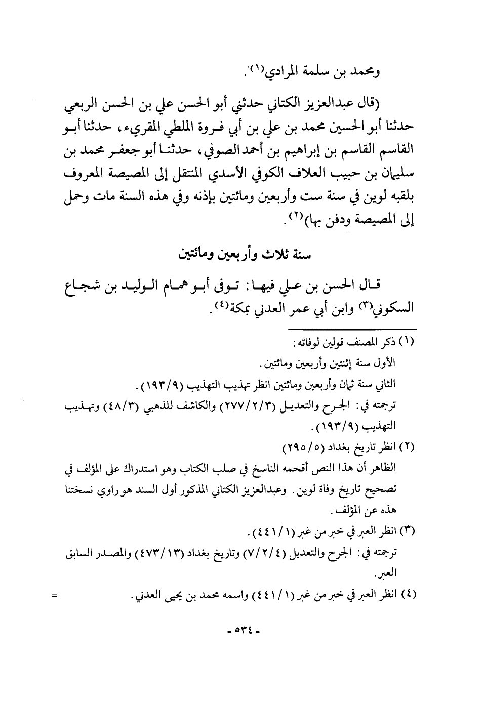 (قَالَ عبد الْعَزِيز الكتاني حَدثنِي أَبُو الْحسن عَليّ بن الْحسن الربعِي حَدثنَا أَبُو الْحُسَيْن مُحَمَّد بن عَليّ بن أبي فَرْوَة الْمَلْطِي المقريء حَدثنَا أَبُو الْقَاسِم الْقَاسِم بن إِبْرَاهِيم بن أَحْمد الصُّوفِي حَدثنَا أَبُو جَعْفَر مُحَمَّد بن سُلَيْمَان بن حبيب العلاف الْكُوفِي الْأَسدي الْمُنْتَقل إِلَى المصيصة الْمَعْرُوف بلقبه لوين فِي سنة سِتّ وَأَرْبَعين وَمِائَتَيْنِ بِإِذْنِهِ وَفِي هَذِه السّنة مَاتَ وَحمل إِلَى المصيصة وَدفن بهَا)