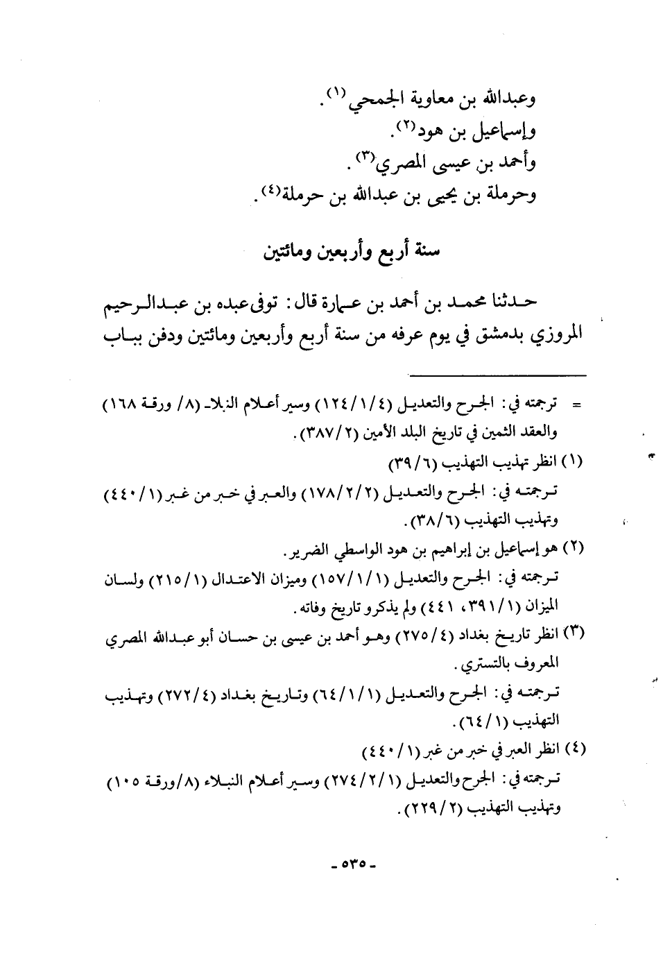 حَدثنَا مُحَمَّد بن أَحْمد بن عمَارَة قَالَ توفى عَبده بن عبد الرَّحِيم الْمروزِي بِدِمَشْق فِي يَوْم عَرَفَة من سنة أَربع وَأَرْبَعين وَمِائَتَيْنِ وَدفن بِبَاب