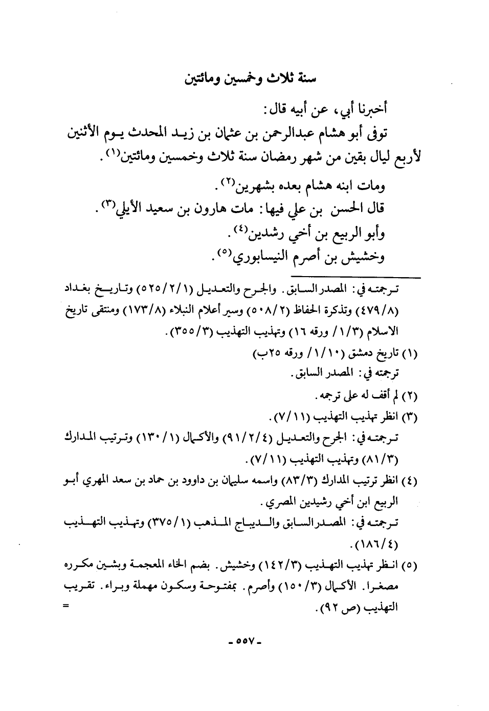 أخبرنَا أبي عَن أَبِيه قَالَ توفّي أَبُو هِشَام عبد الرَّحْمَن بن عُثْمَان بن زيد الْمُحدث يَوْم الأثنين لأَرْبَع لَيَال بَقينَ من شهر رَمَضَان سنة ثَلَاث وَخمسين وَمِائَتَيْنِ وَمَات ابْنه هِشَام بعده بشهرين قَالَ الْحسن بن عَليّ فِيهَا مَاتَ هَارُون بن سعيد الْأَيْلِي وَأَبُو الرّبيع بن أخي رشدين وخشيش بن أَصْرَم النَّيْسَابُورِي