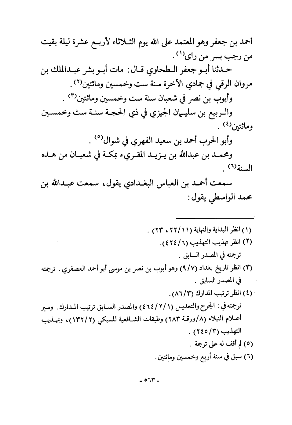 حَدثنَا أَبُو جَعْفَر الطَّحَاوِيّ قَالَ مَاتَ أَبُو بشر عبد الْملك بن مَرْوَان الرقي فِي جمادي الْآخِرَة سنة سِتّ وَخمسين وَمِائَتَيْنِ وايوب بن نصر فِي شعْبَان سنة سِتّ وَخمسين وَمِائَتَيْنِ وَالربيع بن سُلَيْمَان الجيزي فِي ذِي الْحجَّة سنة سِتّ وَخمسين وَمِائَتَيْنِ وَأَبُو الْحَرْب أَحْمد بن سعيد الفِهري فِي شَوَّال وَمُحَمّد بن عبد الله بن يزِيد المقريء بِمَكَّة فِي شعْبَان من هَذِه السّنة