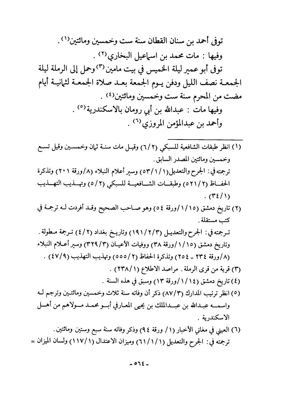 توفّي أَحْمد بن سِنَان الْقطَّان سنة سِتّ وَخمسين وَمِائَتَيْنِ وفيهَا مَاتَ مُحَمَّد بن اسماعيل البُخَارِيّ توفّي أَبُو عُمَيْر لَيْلَة الْخَمِيس فِي بَيت مامين وَحمل إِلَى الرملة لَيْلَة الْجُمُعَة نصف اللَّيْل وَدفن يَوْم الْجُمُعَة بعد صَلَاة الْجُمُعَة لثمانية ايام مَضَت من الْمحرم سنة سِتّ وَخمسين وَمِائَتَيْنِ وفيهَا مَاتَ عبد الله بن أبي رُومَان بالاسكندرية وَأحمد بن عبد الْمُؤمن الْمروزِي