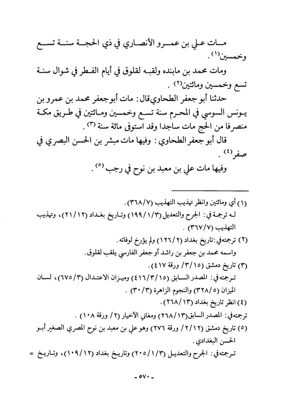 قَالَ أَبُو جَعْفَر الطَّحَاوِيّ وفيهَا مَاتَ مُبشر بن الْحسن الْبَصْرِيّ فِي صفر وفيهَا مَاتَ عَليّ بن معبد بن نوح فِي رَجَب
