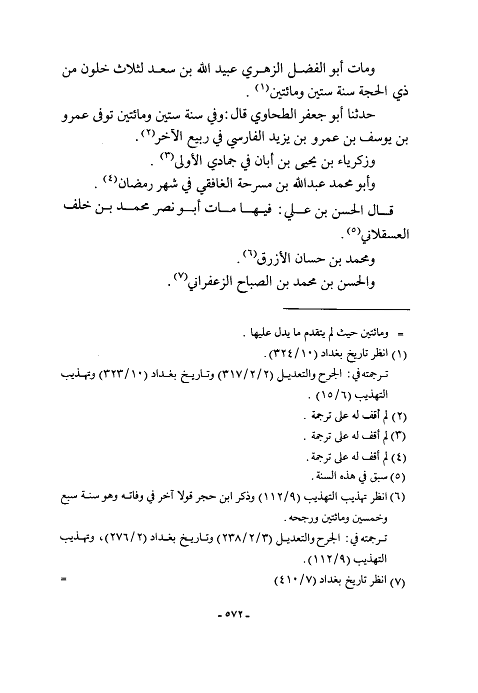 حَدثنَا أَبُو جَعْفَر الطَّحَاوِيّ قَالَ وَفِي سنة سِتِّينَ وَمِائَتَيْنِ توفّي عَمْرو بن يُوسُف بن عَمْرو بن يزِيد الْفَارِسِي فِي ربيع الآخر وزكرياء بن يحيى بن أبان فِي جمادي الأولى وَأَبُو مُحَمَّد عبد الله بن مسرحة الغافقي فِي شهر رَمَضَان