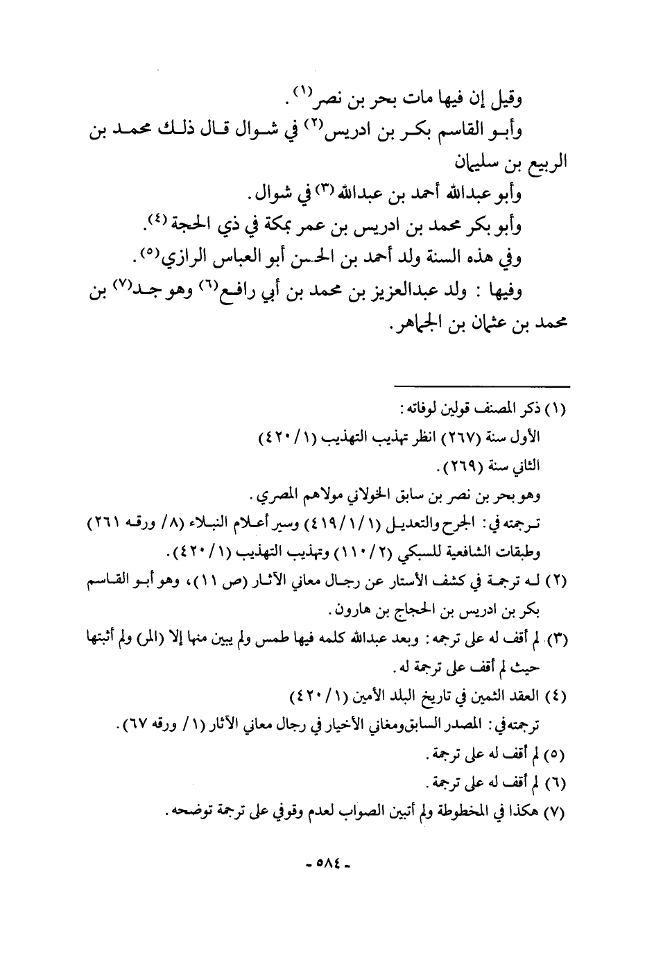 وَقيل إِن فِيهَا مَاتَ بَحر بن نصر وابو الْقَاسِم بكر بن ادريس فِي شَوَّال قَالَ ذَلِك مُحَمَّد بن الرّبيع بن سُلَيْمَان وَأَبُو عبد الله أَحْمد بن عبد الله فِي شَوَّال وَأَبُو بكر مُحَمَّد بن ادريس بن عمر بِمَكَّة فِي ذِي الْحجَّة وَفِي هَذِه السّنة ولد أَحْمد بن الْحسن أَبُو الْعَبَّاس الرَّازِيّ وفيهَا ولد عبد الْعَزِيز بن مُحَمَّد بن أبي رَافع وَهُوَ جد بن مُحَمَّد بن عُثْمَان بن الْجمَاهِر