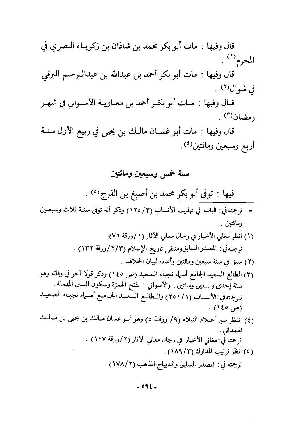 قَالَ وفيهَا مَاتَ أَبُو بكر مُحَمَّد بن شَاذان بن زَكَرِيَّاء الْبَصْرِيّ فِي الْمحرم قَالَ وفيهَا مَاتَ أَبُو بكر أَحْمد بن عبد الله بن عبد الرَّحِيم البرقي فِي شَوَّال قَالَ وفيهَا مَاتَ أَبُو بكر أَحْمد بن مُعَاوِيَة الأسواني فِي شهر رَمَضَان قَالَ وفيهَا مَاتَ أَبُو غَسَّان مَالك بن يحيى فِي ربيع الأول سنة أَربع وَسبعين وَمِائَتَيْنِ