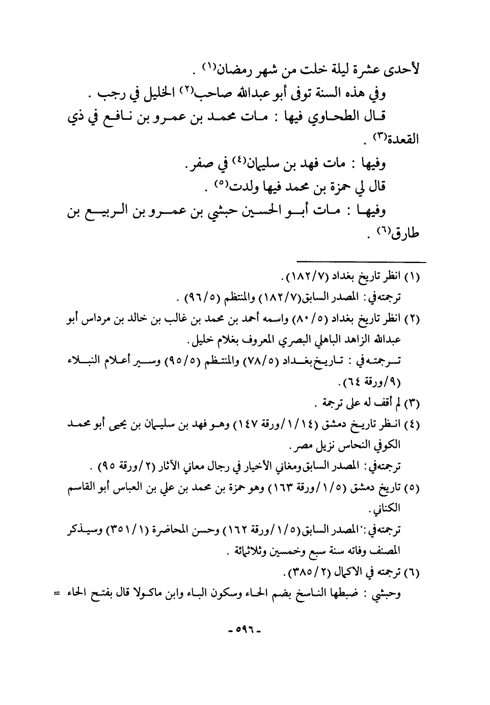لأحدى عشرَة لَيْلَة خلت من شهر رَمَضَان وَفِي هَذِه السّنة توفّي أَبُو عبد الله صَاحب الْخَلِيل فِي رَجَب قَالَ الطَّحَاوِيّ فِيهَا مَاتَ مُحَمَّد بن عَمْرو بن نَافِع فِي ذِي الْقعدَة وفيهَا مَاتَ فَهد بن سُلَيْمَان فِي صفر قَالَ لي حَمْزَة بن مُحَمَّد فِيهَا ولدت وفيهَا مَاتَ أَبُو الْحُسَيْن حبشِي بن عَمْرو بن الرّبيع بن طَارق