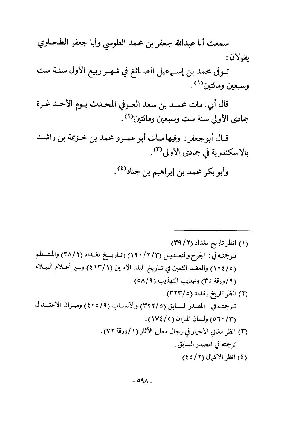 سَمِعت أَبَا عبد الله جَعْفَر بن مُحَمَّد الطوسي وَأَبا جَعْفَر الطَّحَاوِيّ يَقُولَانِ توفّي مُحَمَّد بن إِسْمَاعِيل الصَّائِغ فِي شهر ربيع الأول سنة سِتّ وَسبعين وَمِائَتَيْنِ قَالَ أبي مَاتَ مُحَمَّد بن سعد الْعَوْفِيّ الْمُحدث يَوْم الْأَحَد غرَّة جمادي الأولى سنة سِتّ وَسبعين وَمِائَتَيْنِ قَالَ أَبُو جَعْفَر وفيهَا مَاتَ أَبُو عَمْرو مُحَمَّد بن خُزَيْمَة بن رَاشد بالاسكندرية فِي جمادي الأولى وَأَبُو بكر مُحَمَّد بن إِبْرَاهِيم بن جناد