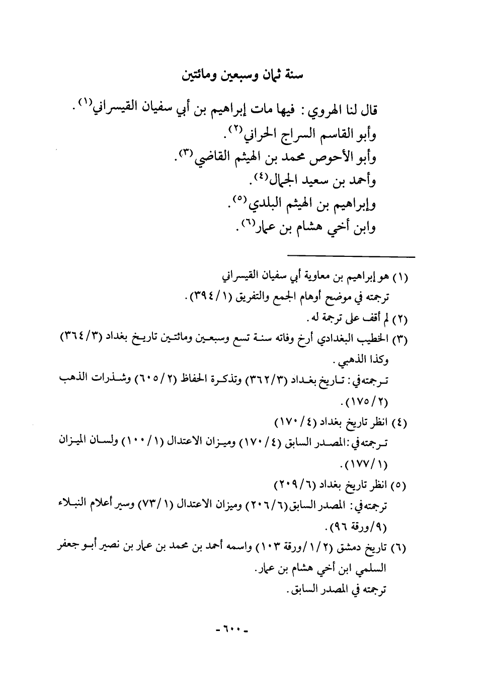 سنة ثَمَان وَسبعين وَمِائَتَيْنِ قَالَ لنا الْهَرَوِيّ فِيهَا مَاتَ إِبْرَاهِيم بن أبي سُفْيَان القيسراني وَأَبُو الْقَاسِم السراج الْحَرَّانِي وَأَبُو الْأَحْوَص مُحَمَّد بن الْهَيْثَم القَاضِي وَأحمد بن سعيد الْجمال وَإِبْرَاهِيم بن الْهَيْثَم الْبَلَدِي وَابْن أخي هِشَام بن عمار