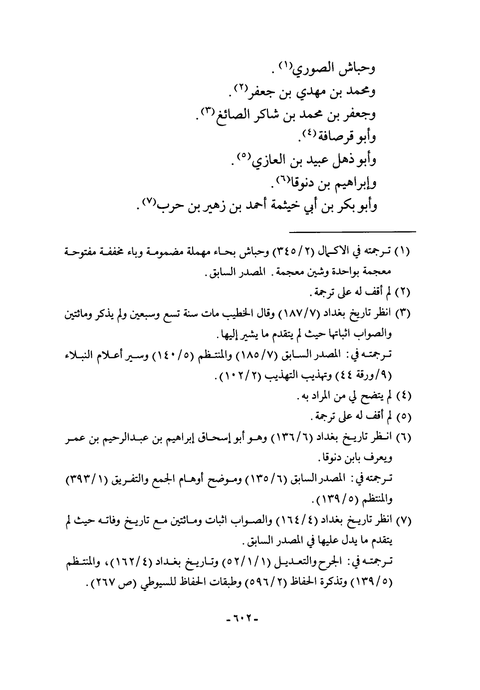 وحباش الصُّورِي وَمُحَمّد بن مهْدي بن جَعْفَر وجعفر بن مُحَمَّد بن شَاكر الصَّائِغ وَأَبُو قرصافة وَأَبُو ذهل عبيد بن العازي وَإِبْرَاهِيم بن دنوقا وَأَبُو بكر بن أبي خَيْثَمَة أَحْمد بن زُهَيْر بن حَرْب