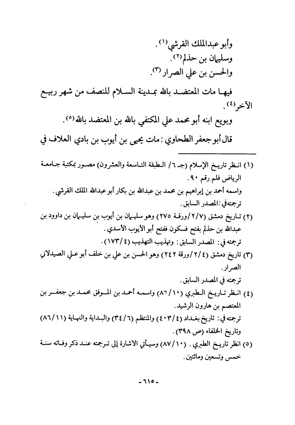 وابو عبد الْملك الْقرشِي وَسليمَان بن حذلم وَالْحسن بن عَليّ الصرار فِيهَا مَاتَ المعتضد بِاللَّه بِمَدِينَة السَّلَام لِلنِّصْفِ من شهر ربيع الآخر وبويع ابْنه أَبُو مُحَمَّد عَليّ المكتفي بِاللَّه بن المعتضد بِاللَّه قَالَ أَبُو جَعْفَر الطَّحَاوِيّ مَاتَ يحيى بن أَيُّوب بن بَادِي العلاف فِي