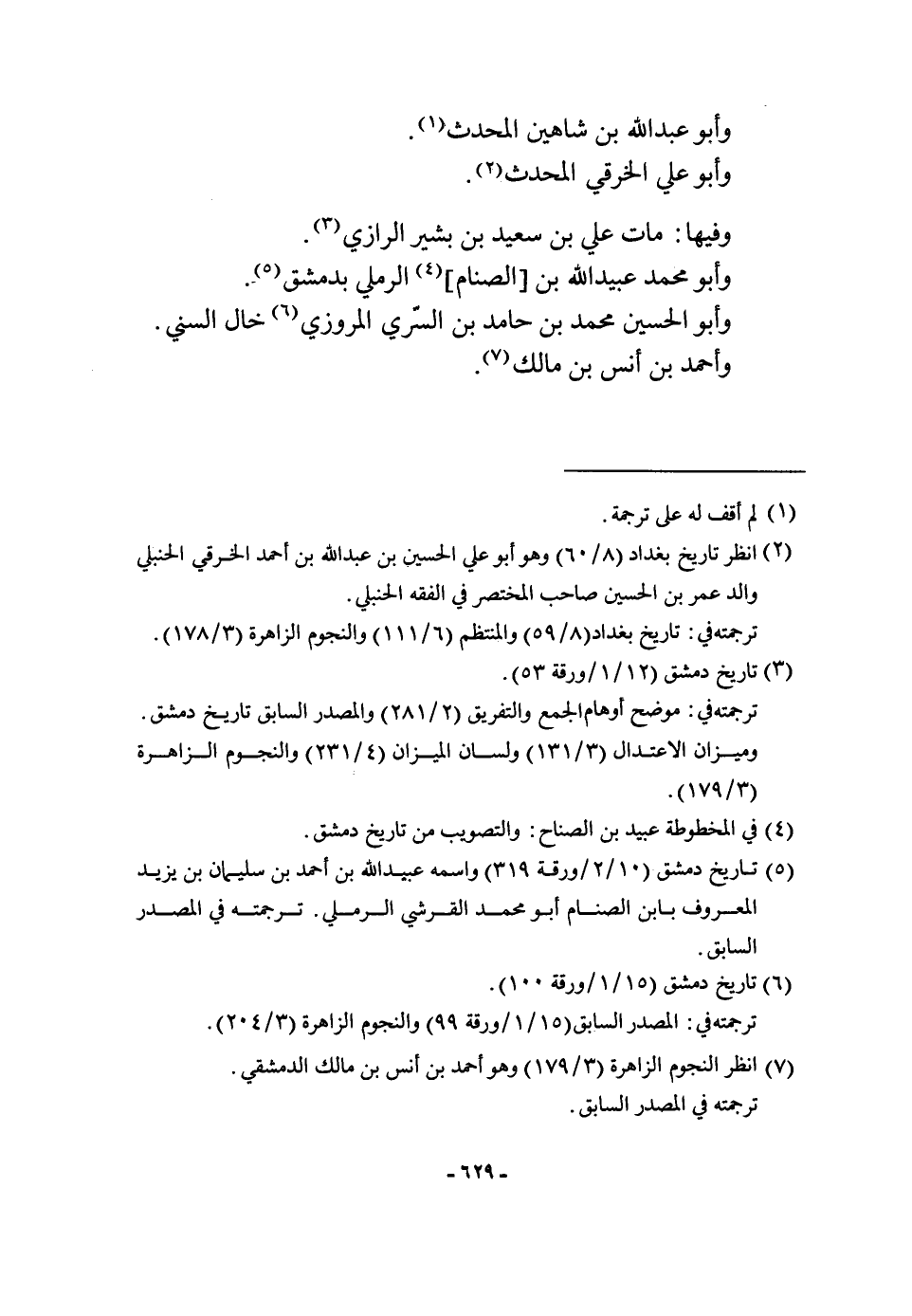 وَأَبُو عبد الله بن شاهين الْمُحدث وَأَبُو عَليّ الْخرقِيّ الْمُحدث وفيهَا مَاتَ عَليّ بن سعيد بن بشير الرَّازِيّ وابو مُحَمَّد عبيد الله بن [الصنام] الرَّمْلِيّ بِدِمَشْق وَأَبُو الْحُسَيْن مُحَمَّد بن حَامِد بن السّري الْمروزِي خَال السّني وَأحمد بن أنس بن مَالك