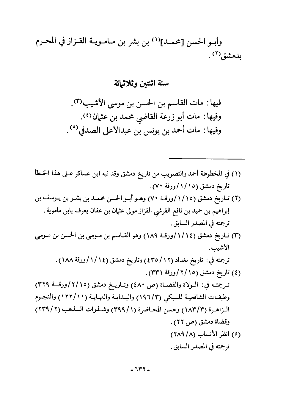 سنة اثْنَتَيْنِ وثلاثمائة فِيهَا مَاتَ الْقَاسِم بن الْحسن بن مُوسَى الأشيب وفيهَا مَاتَ أَبُو زرْعَة القَاضِي مُحَمَّد بن عُثْمَان وفيهَا مَاتَ أَحْمد بن يُونُس بن عبد الْأَعْلَى الصَّدَفِي