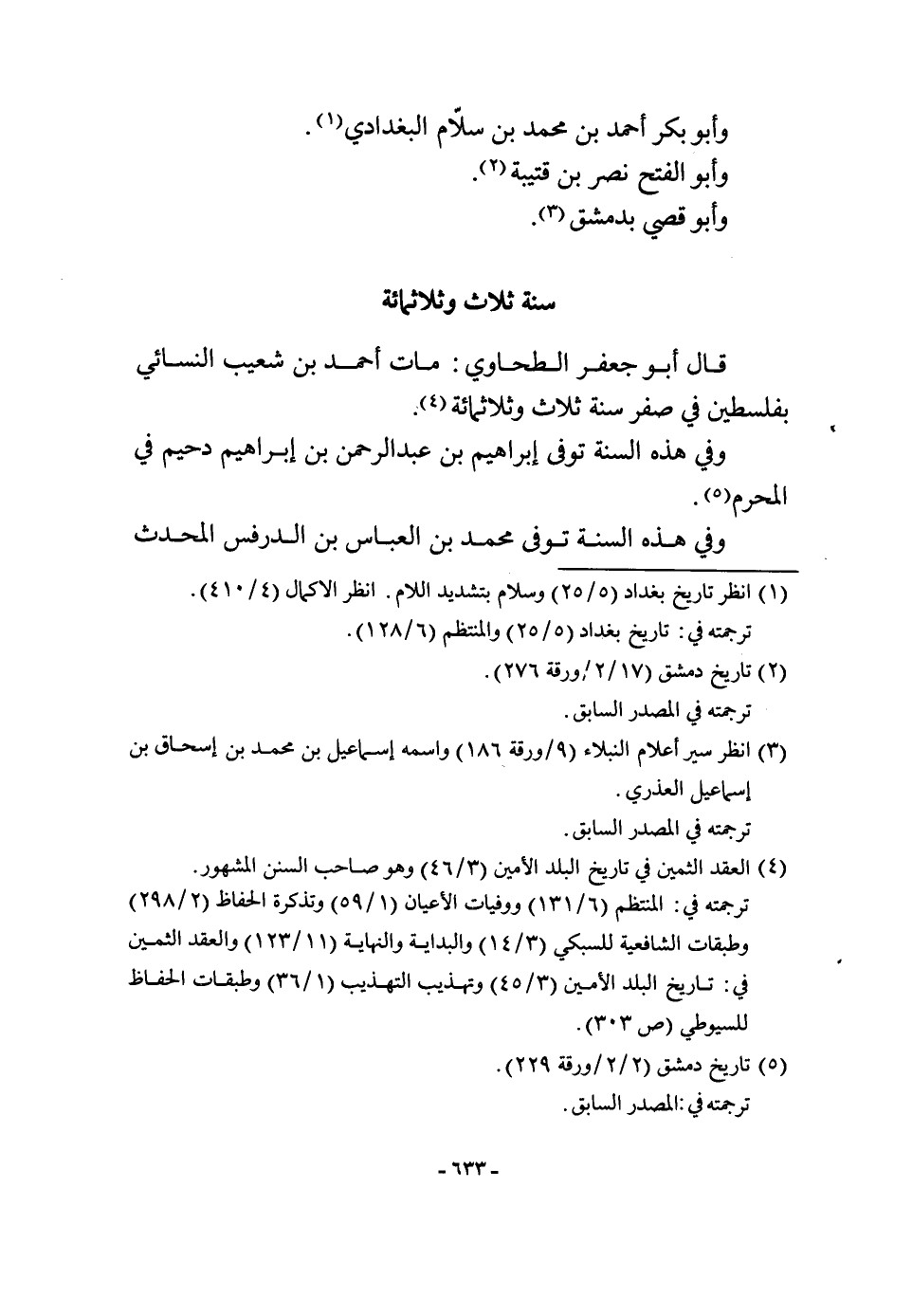 سنة ثَلَاث وثلاثمائة قَالَ ابو جَعْفَر الطَّحَاوِيّ مَاتَ أَحْمد بن شُعَيْب النَّسَائِيّ بفلسطين فِي صفر سنة ثَلَاث وثلاثمائة وَفِي هَذِه السّنة توفّي إِبْرَاهِيم بن عبد الرَّحْمَن بن إِبْرَاهِيم دُحَيْم فِي الْمحرم وَفِي هَذِه السّنة توفّي مُحَمَّد بن الْعَبَّاس بن الدرفس الْمُحدث