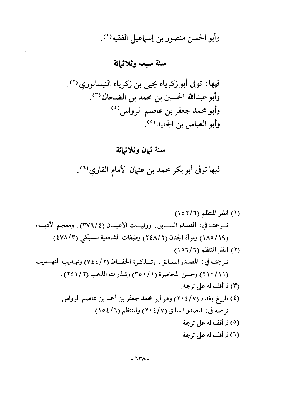 سنة سَبْعَة وثلاثمائة فِيهَا توفّي أَبُو زَكَرِيَّاء يحيى بن زَكَرِيَّاء النَّيْسَابُورِي وَأَبُو عبد الله الْحُسَيْن بن مُحَمَّد بن الضَّحَّاك وَأَبُو مُحَمَّد جَعْفَر بن عَاصِم الرواس وَأَبُو الْعَبَّاس بن الجليد