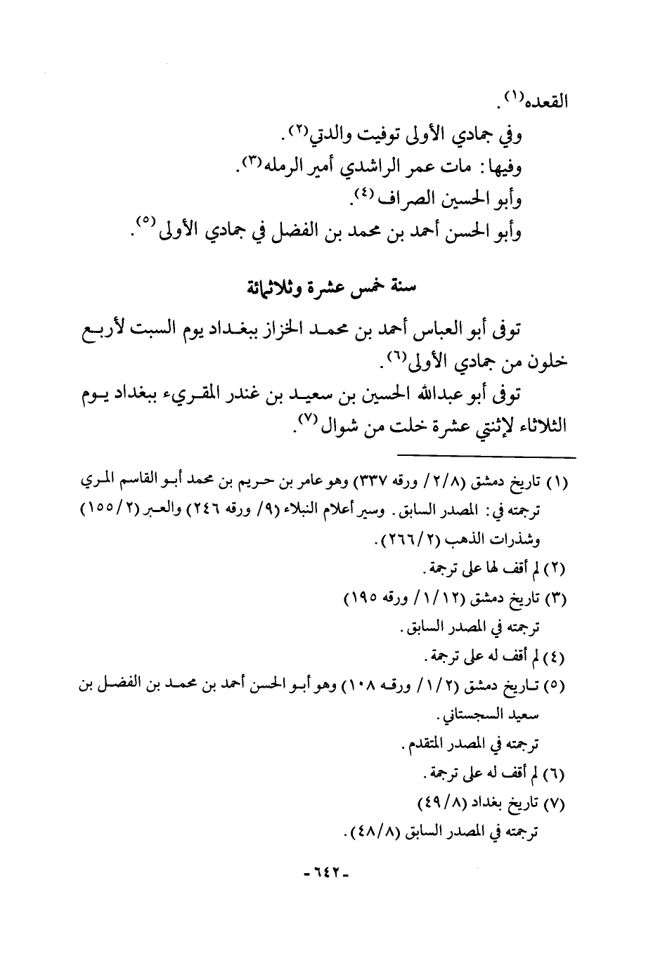 الْقعدَة وَفِي جمادي الأولى توفيت والدتي وفيهَا مَاتَ عمر الرَّاشِدِي أَمِير الرملة وَأَبُو الْحُسَيْن الصراف وَأَبُو الْحسن أَحْمد بن مُحَمَّد بن الْفضل فِي جمادي الأولى